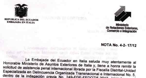 Quito, 15 de marzo del 2012.- La embajada ecuatoriana en Italia remitió al Ministerio de Relaciones Exteriores de ese país a la solicitud de Asistencia Penal Internacional pedida por Galo Chiriboga, fiscal General del Estado.
