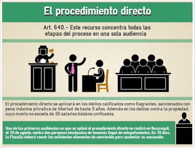 Es decir, con la aplicación de este procedimiento, tipificado en el artículo 640 del Código Orgánico Integral Penal (COIP), se omite la audiencia de la etapa intermedia y se pasa directamente de la audiencia de flagrancia a la de juicio directo, en 10 días.