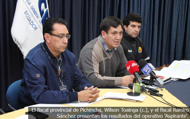 Quito, 05 de junio del 2015.- Una organización delictiva dedica a posible falsificación de documentos y de tramitar ilegalmente el ingreso de aspirantes a la Policía Nacional fue desbaratada la madrugada de este viernes 5 de junio. Eso se logró durante el operativo ‘Aspirante’, liderado por la Fiscalía Provincial de Pichincha, en cinco sectores de Quito, Pichincha, y en Guaranda, provincia de Bolívar.