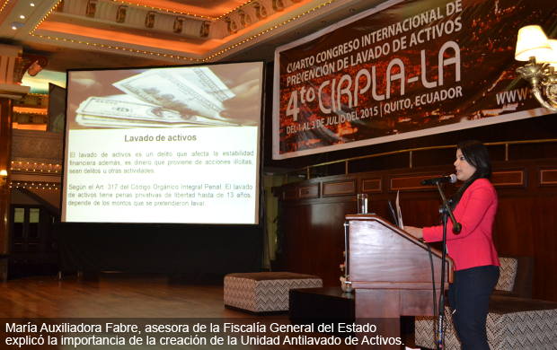 María Auxiliadora Fabre, asesora de la Fiscalía, en su conferencia destacó la creación de la Unidad Antilavado de Activos en la administración de Galo Chiriboga Zambrano. “El objetivo es detectar el capital financiero producto de actividades ilícitas que se pretende fusionar en la economía del país”, dijo.