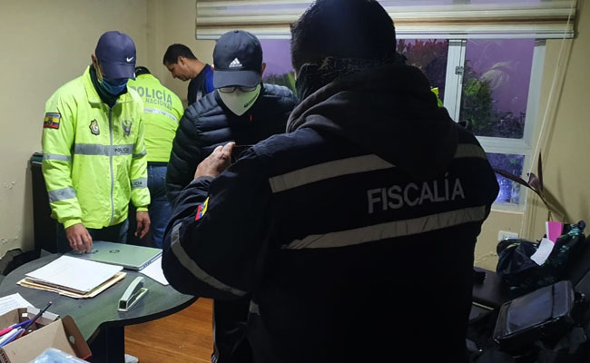 Antonio Ante (Imbabura), 14 de mayo de 2020.- La Fiscalía Provincial de Imbabura, con el apoyo de la Policía Nacional, allanó tres inmuebles, entre ellos las oficinas del Municipio del cantón Antonio Ante, por presuntas irregularidades en la adquisición de alrededor de veinte canecas de desinfectante de amonio cuaternario, por un valor de 425 dólares, cuando los precios en el mercado oscilan entre 45 y 160 dólares.