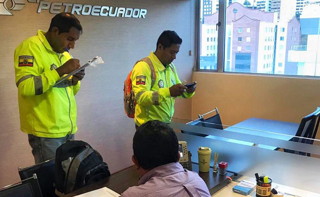 Quito, 08 de agosto de 2019.- El fiscal Luis Rosero, de la Unidad de Transparencia, Lucha Contra la Corrupción y Antilavado de Activos, junto a personal policial de ULA, ejecutó tres allanamientos en el norte de Quito: en los domicilios de Raúl T., exfuncionario de Petroecuador, y del ciudadano Roberto B., en horas de la mañana de este jueves 8 de agosto; y en las oficinas del piso doce de la Petrolera Estatal, la tarde y noche del mismo día.