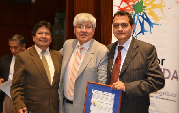 Rubén Chiriboga, director ejecutivo del Indot, entregó la placa de reconocimiento a Teodoro Barros, director de Escuela de Fiscales de la Fiscalía General del Estado, quien asistió al acto en representación de la máxima autoridad institucional.