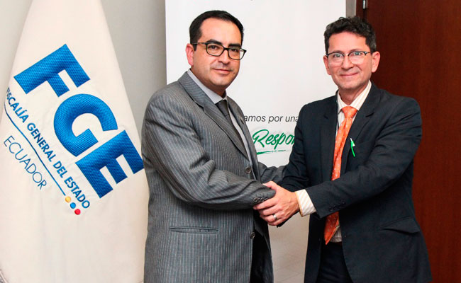 Quito, 07 de junio de 2018.- Para facilitar el intercambio de información, capacitación y asesoría técnica, orientado al fortalecimiento de la investigación penal en materia de minería ilegal, la Fiscalía General del Estado (FGE) representada por el Dr. Paúl Pérez Reina y la Agencia de Regulación y Control Minero (ARCOM), por su Director Ejecutivo, el Ing. Jorge Segovia Burbano, suscribieron esta tarde un Convenio Marco de Cooperación Interinstitucional.