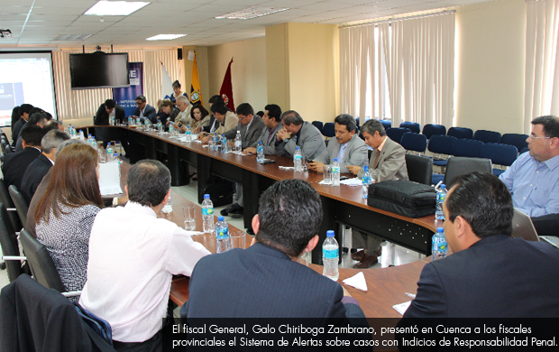El miércoles 11 de febrero pasado, en una reunión en Cuenca, el fiscal General, Galo Chiriboga Zambrano, presentó este Sistema de Alertas a los fiscales provinciales y expuso el propósito de la aplicación. El Reporte de Alertas es una herramienta virtual diseñada para controlar y realizar seguimiento de las actuaciones fiscales en los diferentes procesos, por medio de semáforos que indican el estado de avance de las actuaciones fiscales. Este reporte es de utilidad tanto para las autoridades como para los equipos misionales responsables de investigar casos con Indicios de Responsabilidad Penal.