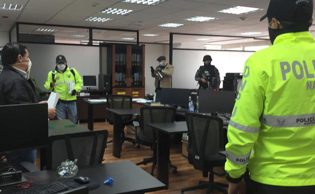 Quito (Pichincha), 07 de mayo de 2020.- La Fiscalía General del Estado (FGE), en coordinación con la Policía Nacional, ejecutó trece allanamientos en Ambato, Otavalo, Latacunga, Sangolquí y Quito, uno de estos al Ministerio de Finanzas, con el objetivo de recabar indicios para la investigación que lleva a cabo la Unidad de Transparencia y Lucha contra la Corrupción de la FGE, respecto a la existencia de una presunta red de corrupción que opera en contubernio con funcionarios, desde el interior de algunas instituciones públicas incluida la cartera de Finanzas.