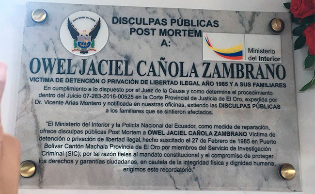 El acto de reparación simbólica a nombre de la Policía Nacional fue ofrecido por la Comandancia Provincial de la Policía con sede en El Oro, en la Casa de la Cultura en Puerto Bolívar. En la placa Pos Morten, develada en memoria de Owel, se afirma que fue víctima de detención ilegal por parte de agentes del Servicio de Investigación Criminal (SIC), de El Oro.