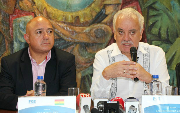 Galo Chiriboga, fiscal General ecuatoriano, e Iván Montellano (izq.), fiscal superior de Bolivia, en la reunión en Guayaquil, Ecuador, para compartir las investigaciones locales sobre el caso FIFAGate.