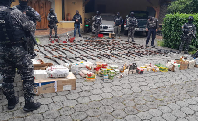 Quito (Pichincha), 18 de enero de 2024.- Más de 100 armas de fuego fueron encontradas en una vivienda ubicada en Cumbayá. Por ese motivo, la Fiscalía General del Estado inició un proceso penal contra José Alfredo E. por su presunta participación en el delito de tráfico ilícito de armas de fuego, armas químicas, nucleares o biológicas. Fue aprehendido en un operativo ejecutado por Fiscalía, en coordinación con Policía Nacional, la madrugada del 17 de enero del año en curso.