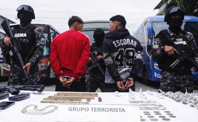 Guayaquil (Guayas), 25 de enero de 2024.- La Fiscalía procesó a dos presuntos cabecillas de una organización delictiva y brazo armado de “Los Choneros”, tras operativos realizados por los bloques de seguridad de la Policía Nacional y Fuerzas Armadas, en los sectores de Flor de Bastión y Ciudad Victoria, en el distrito Nueva Prosperina, al noreste de Guayaquil, la madrugada del miércoles 24 de enero.