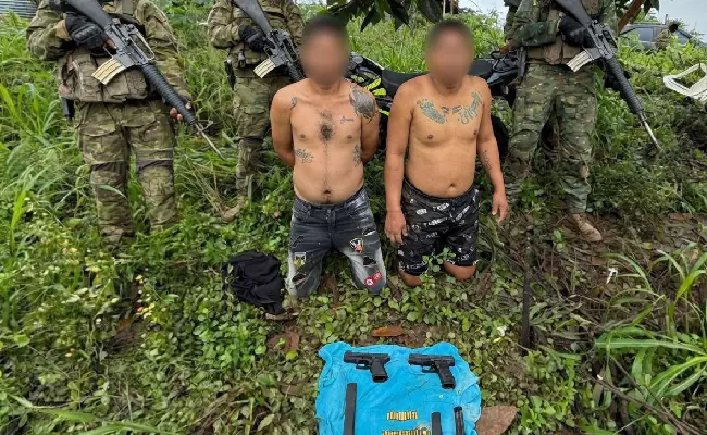 En un operativo ejecutado en flagrancia, agentes policiales, con apoyo de una patrulla de las Fuerzas Armadas, llegaron al lugar y observaron a dos personas que, al notar su presencia, intentaron huir e internarse en un terreno, donde arrojaron dos objetos. Ambos fueron capturados a pocos metros.