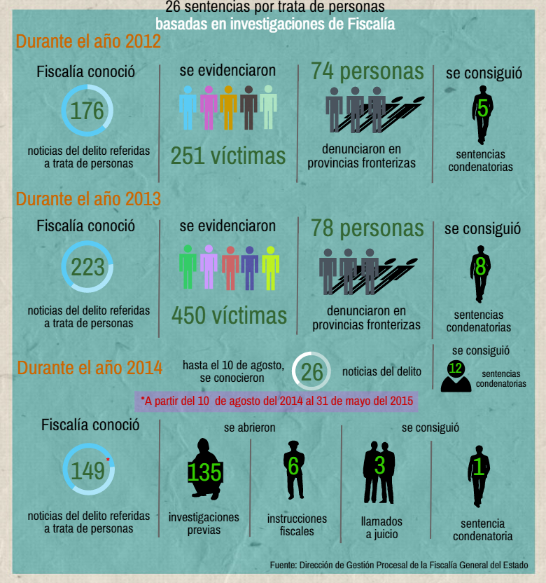 Tres personas fueron sentenciadas a ocho años de reclusión mayor y uno a cuatro años. El Tribunal de Garantías Penales de Imbabura los consideró autores de trata de personas con fines de explotación sexual.