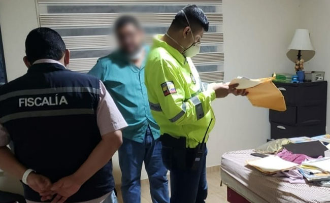 Guayaquil (Guayas), 26 de febrero de 2021.- En varios allanamientos ejecutados la noche del jueves 25 de febrero en Guayaquil, tres personas fueron detenidas por su presunta participación en delito de peculado en la compra de insumos médicos al Hospital Teodoro Maldonado Carbo, del Instituto Ecuatoriano de Seguro Social (IESS), en un contrato correspondiente al 2018.