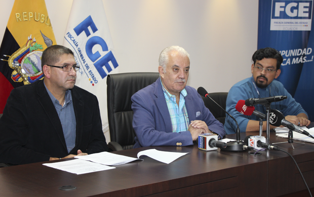 En rueda de prensa, de izquierda a derecha: Alaín Luna, director de Investigaciones de la Fiscalía General del Estado; Galo Chiriboga Zambrano, fiscal General del Estado; Andrés Cuasapaz, fiscal investigador del proceso ‘Cofiec’.