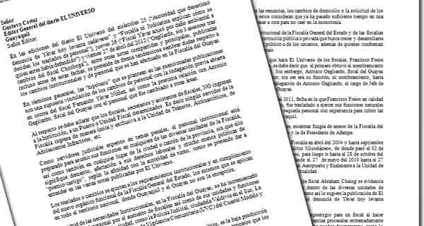 En las ediciones del diario El Universo del miércoles 25 (“Autoridad que desestimó denuncia de Yávar hoy levanta cadáveres” y “Fiscalía ni Judicatura explican cómo se deciden los traslados de personal”), jueves 26 (“Fiscal Yávar acusó por daño ambiental a quien antes había defendido”) y viernes 27 de abril del 2012 (“Gagliardo, sin 3 asesores tras cambios del fiscal Chiriboga”), entre otras notas compartidas y principales, publicadas incluso antes de estas fechas, se pretende de forma tendenciosa sembrar dudas respecto a los cambios institucionales y de personal que se han efectuado en la Fiscalía del Guayas.
