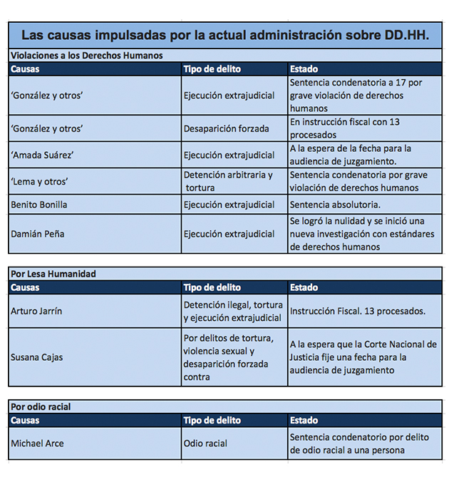 De ahí que la Fiscalía judicializó este caso por ejecución extrajudicial, en el contexto de una grave delito de violación a los derechos humanos. En dos audiencias de juicio, 13 personas fueron sentenciadas (seis de ellos, agentes de Policía) recibieron una pena de 16 años de reclusión mayor especial). Otros cinco se encuentran prófugos.