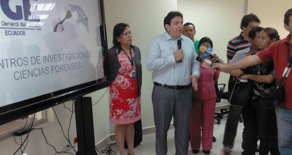 Manta.-Nelson Vinueza y Santiago Velasco, asesores de la Fiscalía General del Estado, explicaron a los medios de comunicación el funcionamiento del nuevo Centro de Investigación de Ciencias Forenses “Abogado Ramón Loor Pincay”, en Manta, provincia de Manabí, que servirá para impulsar la investigación penal, combatir la inseguridad y disminuir la impunidad.