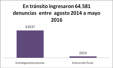 Del 10 de agosto del 2014, fecha que entró en vigencia el COIP, al 30 de mayo del 2016, la Fiscalía registró 64.581 infracciones penales de tránsito. De estas, 53.536 pasaron a fase de investigación previa en la Fiscalía por, presuntamente, considerarse que son delitos. Otras 2.623 llegaron a etapa de instrucción fiscal (inicio del proceso penal).