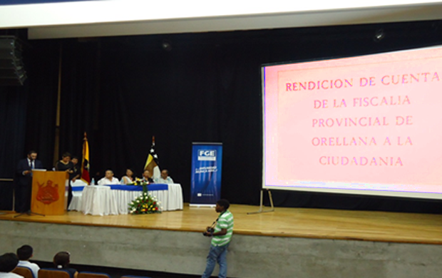 Orellana, 20 de febrero del 2015.- En idioma español, kichwa y wao tededo fue presentado el informe de rendición de cuentas de la gestión 2014, de la Fiscalía provincial de Orellana. El evento se desarrolló en MACCO, auditorio Manuel Villavicencio ante autoridades provinciales.
