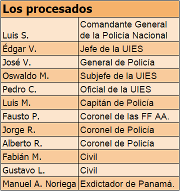 Entre estos 12 procesados constan ocho policías y un militar en servicio pasivo, dos civiles y el exdictador de Panamá, Manuel Antonio Noriega.