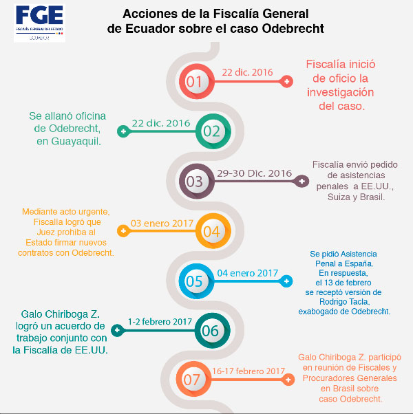 El 22 de diciembre de 2016, inmediatamente, la Fiscalía inició de oficio la investigación del caso Odebrecht. Ese mismo día, se allanaron las oficinas de la constructora en Guayaquil y se incautaron documentos y equipos informáticos.