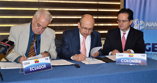 Quito, 18 de noviembre del 2013.- En el marco de la XXI Asamblea de la Asociación Iberoamericana de Ministerios Públicos, que se desarrolla en Quito, la Fiscalía General del Estado de Ecuador firmó convenios de cooperación con Colombia y Chile.