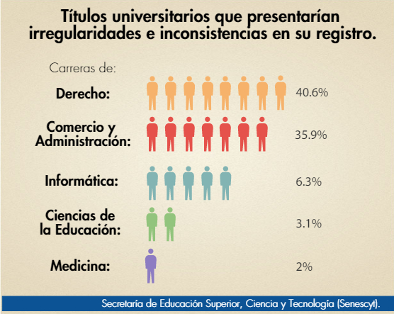 Asimismo indicó que entre los títulos con irregulares el 40.6% de casos corresponde a Derecho, 35.9% a Comercio y Administración, 6.3% a Informática, 3.1% de Ciencias de la Educación y alrededor del 2% a Medicina, entre las principales. Además que son de Azuay, Pichincha, Manabí, Guayas, Loja y Tungurahua.