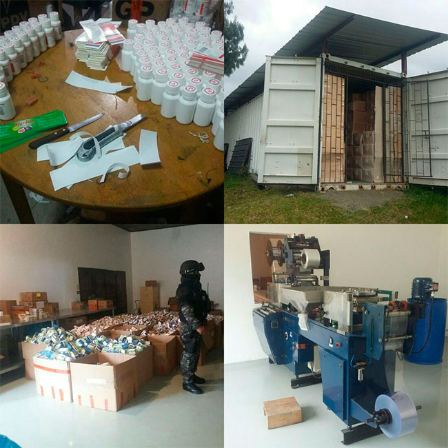 Se incautaron 18 toneladas de medicamentos falsificados (multivitamínicos, antibióticos, antiinflamatorios y otros), así como maquinaria para el envasado de medicamentos, jarabes y suspensiones, que exhibían su etiquetado con nombres de laboratorios extranjeros y registros sanitarios inexistentes.