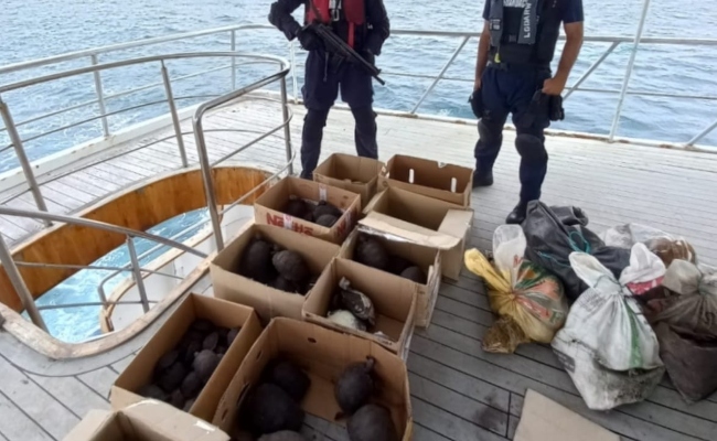 La Armada del Ecuador, a través del Comando de Guardacostas, informó este sábado que aprehendió a dos embarcaciones, a treinta millas náuticas de la Puntilla de Santa Elena y que en una de estas, se transportaban cinco sacos plásticos que contenían –cada uno– cinco iguanas doradas. Además, se hallaron nueve cajas de cartón con ochenta y cuatro tortugas terrestres gigantes.
