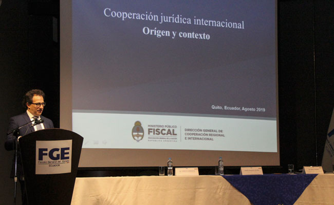 Quito, 14 de agosto de 2019.- La Fiscalía General del Estado (FGE), a través de sus direcciones de Asuntos Internacionales y de Escuela de Fiscales, desarrolló el “Taller de Cooperación Jurídica Internacional en Materia Penal”, facilitado por el doctor Diego Solernó, experto internacional en el tema y delegado del Procurador General de Argentina, Eduardo Ezequiel Casal. En el evento participaron, además de agentes fiscales, secretarios y asistentes –por parte de la FGE–, funcionarios del Ministerio de Relaciones Exteriores e Interpol.