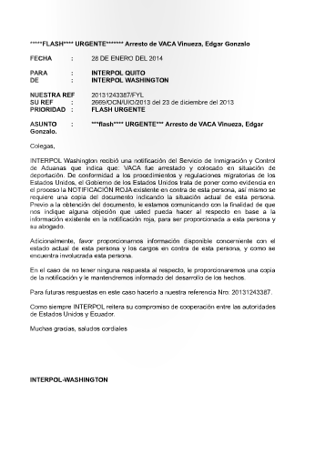 El exgeneral Vaca Vinueza, fue arrestado y puesto en situación de deportación por el servicio de Inmigración y Control de Aduanas, informó la Organización Internacional de Policía Criminal, Interpol, de Whashington a su similar en Quito, a través de un flash urgente enviado el 28 de enero del 2014.