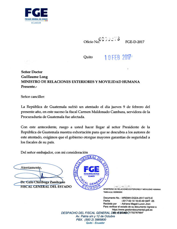 febrero 11, 2017 Galo Chiriboga exhorta a autoridades de Guatemala para que se conozca autores de atentado contra fiscal Carmen Maldonado Cambara Tags: exhorta a autoridades de Guatemala