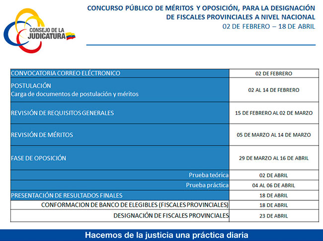 Las postulaciones se receptan del 2 al 14 de febrero, a través de la página www.funcionjudicial.gob.ec. Los aspirantes serán calificados sobre 100 unidades de la siguiente forma: méritos y oposición 10, evaluación teórica 40 y evaluación práctica 50 puntos en donde se simulará una audiencia en la que los postulantes ejercerán el rol de fiscal y demostrarán sus conocimientos para llevar adelante el caso asignado, su capacidad de análisis y la respectiva litigación oral. Un tribunal, integrado por un Juez o Conjuez de la Corte Nacional, un Director Nacional o Provincial del Consejo de la Judicatura y un delegado de la Fiscalía General del Estado, será el encargado de la calificación.