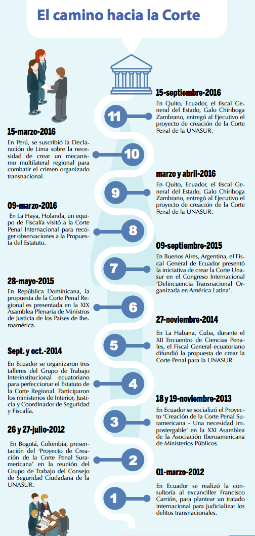 El plan para la creación de la Corte Penal de la Unión de Naciones Suramericanas (UNASUR) nació en medio de la preocupación que se generó cuando el Fiscal General ecuatoriano constató que las estadísticas revelaban que los delitos más graves en Ecuador y en los países de la región son aquellos relacionados con el crimen organizado.