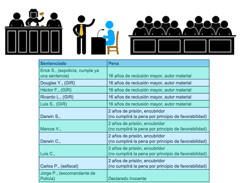 Otros cinco procesados fueron declarados encubridores, pero no cumplirán los dos años de prisión que les impuso el Tribunal, porque les favorece la eliminación del encubrimiento como tipo penal en el actual Código Orgánico Integral Penal.