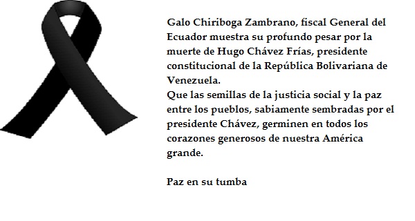 Galo Chiriboga Zambrano, fiscal General del Ecuador muestra su profundo pesar por la muerte de Hugo Chávez Frías, presidente constitucional de la República Bolivariana de Venezuela.