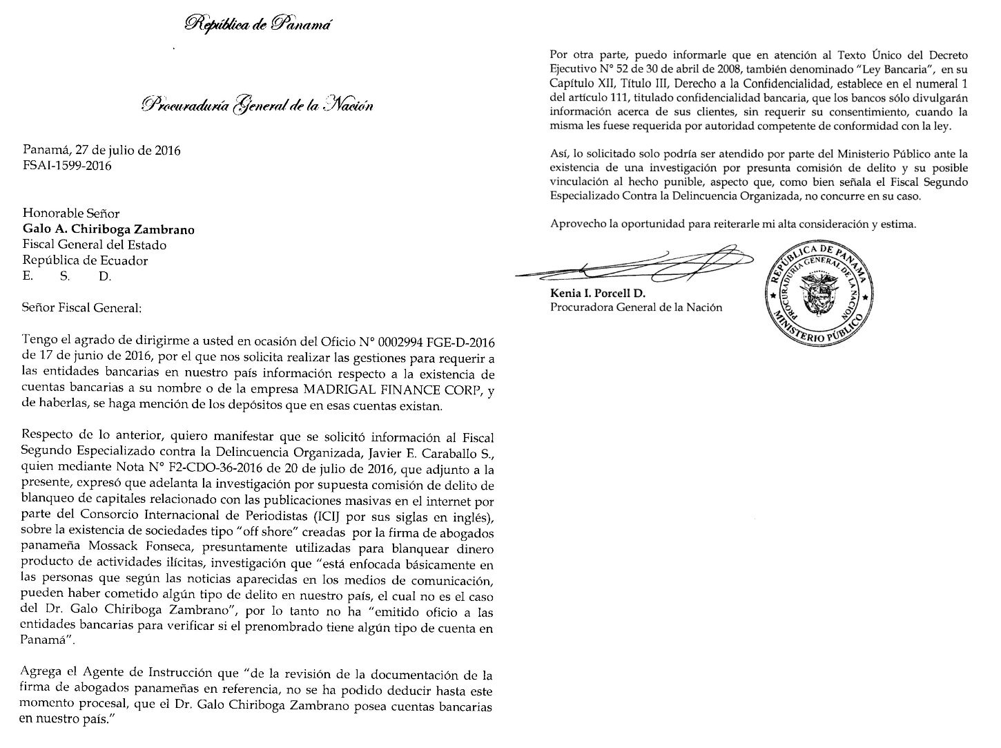 También entregó el certificado del Registro de Público de Panamá, mediante el cual se confirmó que la empresa Madrigal de Galo Chiriboga no posee ningún bien inscrito a su nombre en territorio panameño.