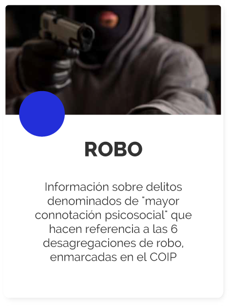 Robo: Información sobre delitos denominados de mayor connotación psicosocial que hacen referencia a las 6 desagregaciones de robo, enmarcadas en el COIP