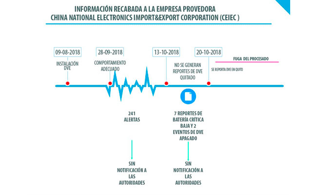 Desde el 28 de septiembre hasta el 13 de octubre de 2018, se dan alertas de pulsera quitada, un comportamiento anormal con un total de 241 alertas en 15 días de un total de 245 registradas. De acuerdo a las investigaciones, del 13 de octubre al 20 de octubre el dispositivo no emite alertas de actividad por lo que se presume que el procesado ya no utilizaba el dispositivo de vigilancia electrónica dichos reportes nunca fueron notificados a las autoridades de control.