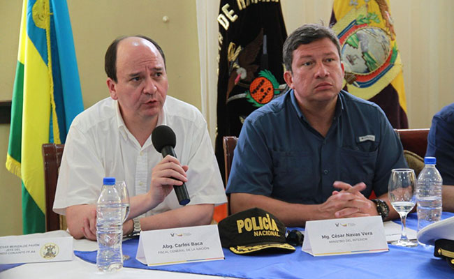 San Lorenzo, 28 de enero de 2018.- El Fiscal General, Doctor Carlos Baca Mancheno, junto con los ministros del Interior, César Navas Vera; de Defensa Patricio Zambrano; la secretaria de Gestión de Riesgos, Alexandra Ocles; entre otras autoridades de Estado, recorrieron las zonas afectadas por el atentado terrorista suscitado en el cantón San Lorenzo la madrugada del pasado sábado.