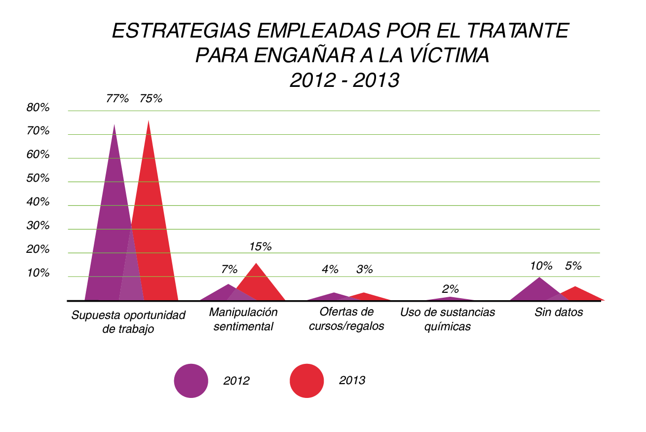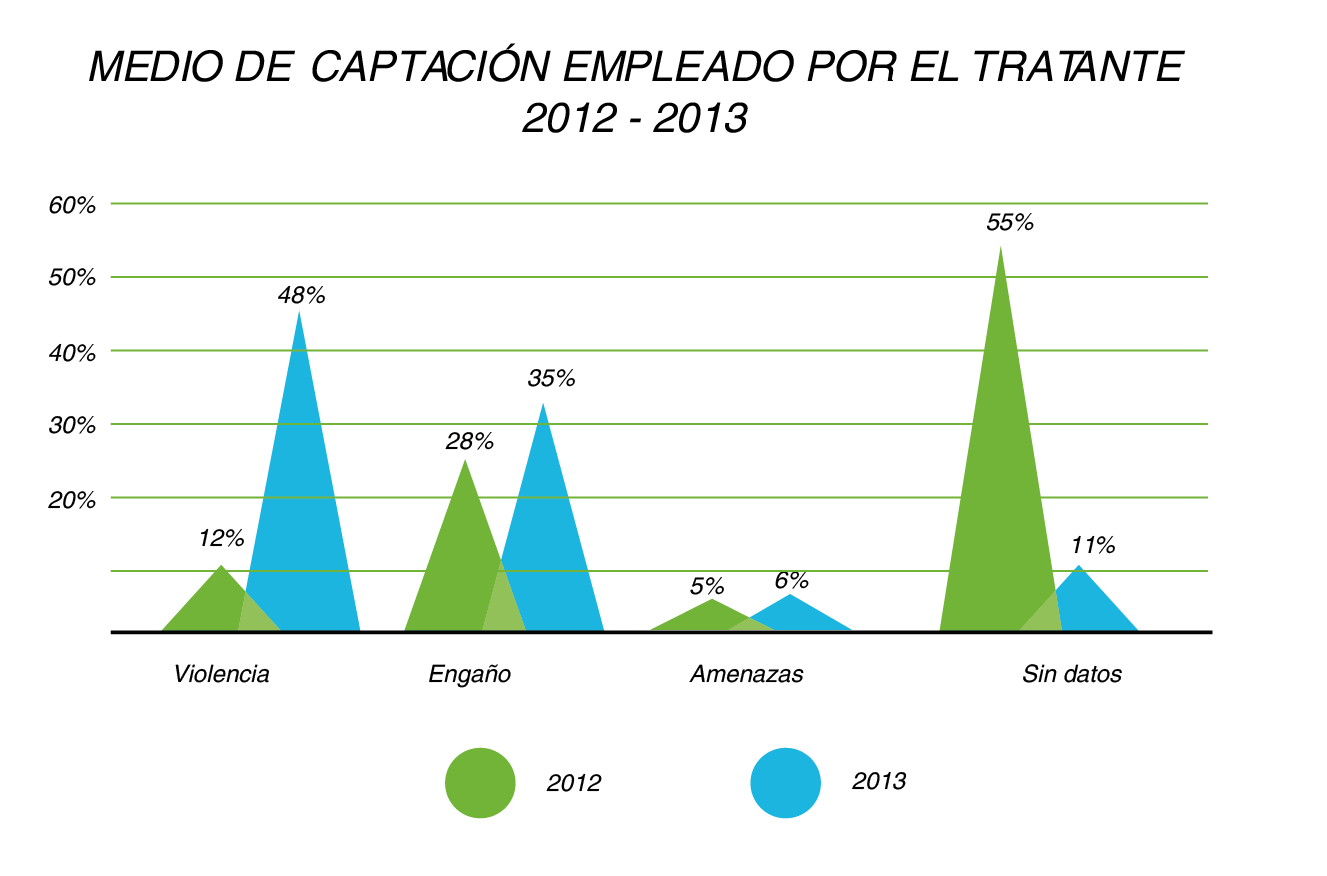 Según datos de la FGE, en 2013, el 48% de las víctimas fue captado de forma violenta, es decir, secuestrado en la calle o a la salida de lugares de estudio o trabajo. Mientras el 35% fue bajo engaño de oferta de un trabajo estable y bien remunerado, por enamoramiento o por promesa de una beca de estudios.