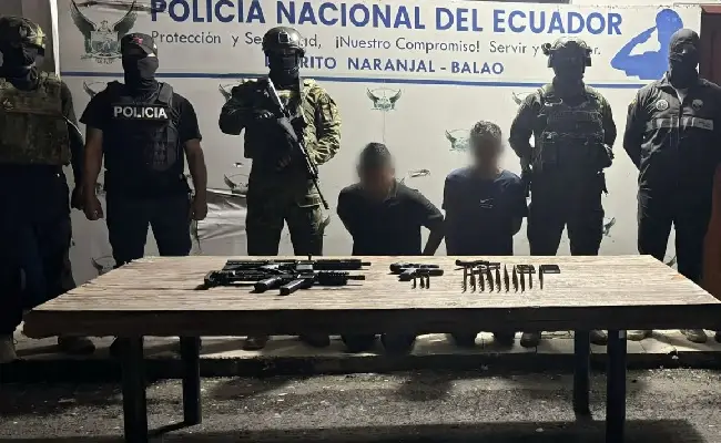 Los aprehendidos fueron trasladados a la Unidad de Policía de Naranjal, mientras que las evidencias –armas, municiones y el vehículo– fueron ingresadas en cadena de custodia de la Policía Judicial.