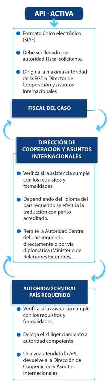 La Fiscalía General del Estado, a través de su unidad operativa en el campo de la cooperación penal internacional, la Dirección de Cooperación y Asuntos Internacionales, gestiona la asistencia judicial recíproca sobre la base de un formato único (solicitud de API) para la petición y práctica de diligencias en el extranjero.